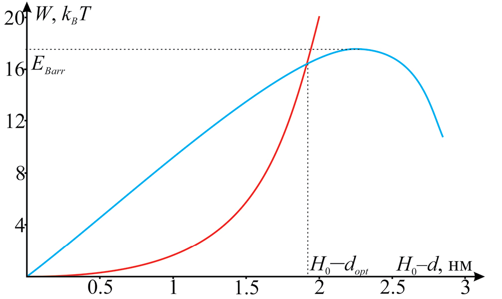 Аналогичным образом рассматриваем зависимость энергии монослоев с дефектами Wtot2 от R при этом же фиксированном значении d (рис. 3б). Эта энергия также имеет минимум, соответствующий другому значению радиуса Rmin2; минимальное значение энергии обозначаем как Wmin2. Таким образом, имеем зависимости энергий Wmin1 и Wmin2 от d. Эти две зависимости пересекаются при определенном значении dopt. При d > dopt энергия системы определяется зависимостью Wmin1, а при d < dopt – зависимостью Wmin2. В результате получаем энергетическую траекторию системы в зависимости от координаты реакции d; пример такой траектории показан на рис. 4. Высота барьера определяется как разность максимальной энергии на траектории и энергии начального состояния. В точке траектории, соответствующей d = 0, образуется монослойный сталк. При этом мы пренебрегаем изменением энергии, связанным со скачкообразным изменением радиуса системы. При малых значениях d энергия системы с гидрофобным дефектом достаточно слабо зависит от R (см. рис. 3, панель б). Поэтому искомое изменение энергии можно оценить в несколько единиц kBT.