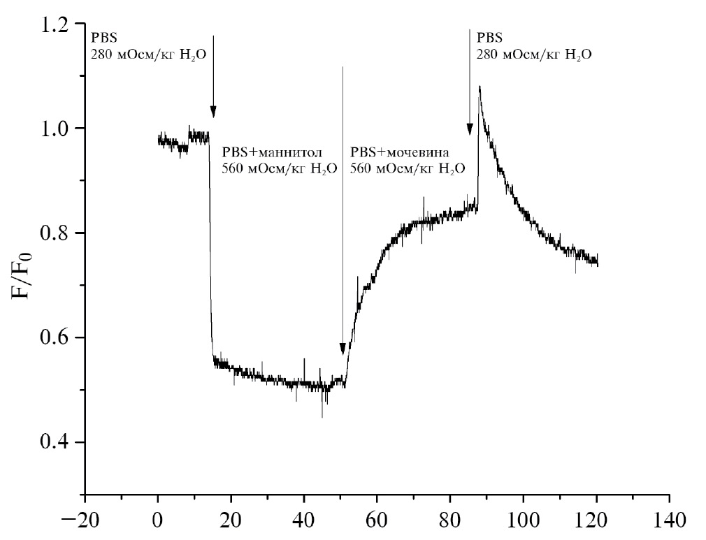 Протокол эксперимента. Клетки уравновешивали в среде PBS (280 мОсм/кг H₂O), меняли среду на PBS+маннитол (560 мОсм/кг H₂O) и уравновешивали клетки в этой гипертонической среде, изотонически меняли среду на PBS+мочевина (560 мОсм/кг H₂O), записывали возрастание флуоресценции в течение 20–30 с, возвращали в среду PBS (280 мОсм/кг H₂O) (рис. 1).