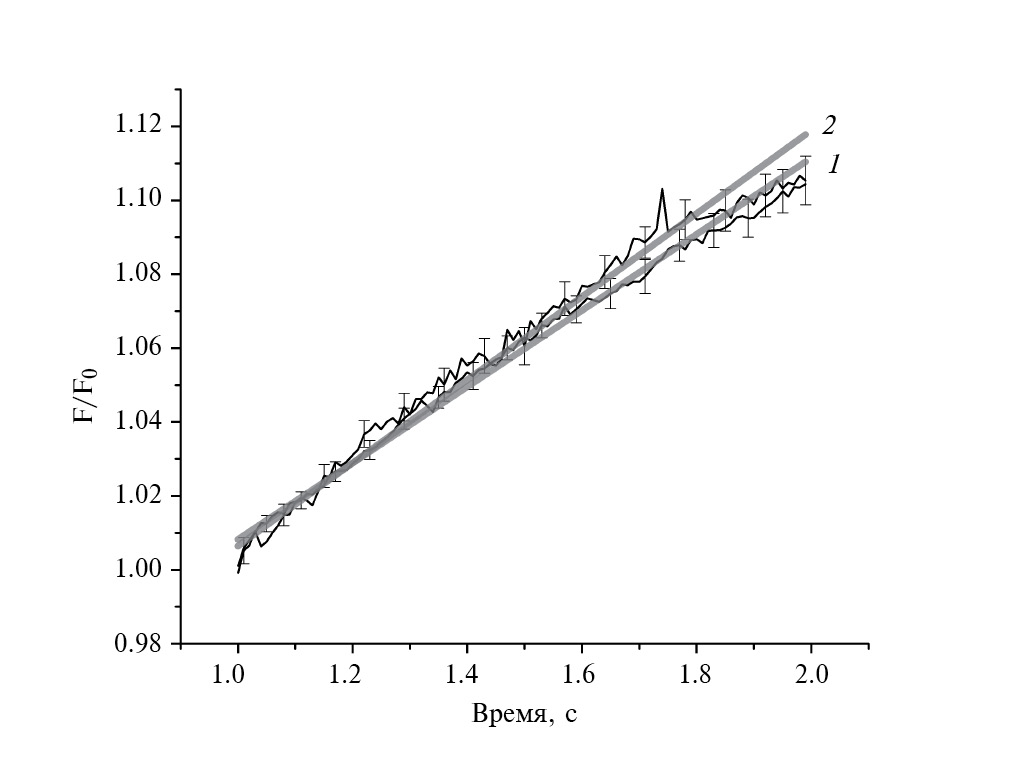 Рис. 5. Начальные участки усредненных профилей динамики относительной флуоресценции красителя Calcein, отражающие повышение объема клеток эндотелия роговицы в гипертонической среде мочевины.
