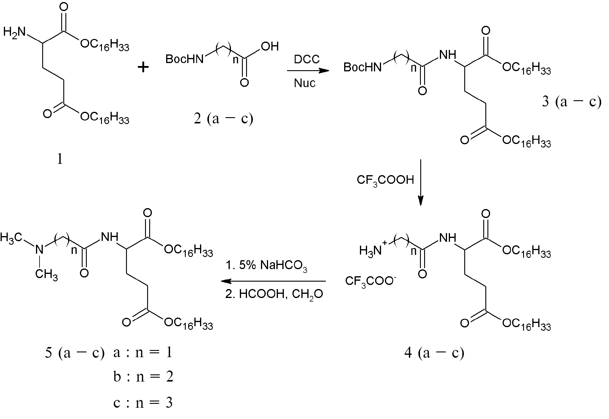 Гидрофобный блок 1 получали путем сплавления L-глутаминовой кислоты с гексадециловым спиртом в присутствии пара-толуолсульфокислоты при 130 °С согласно методу, описанному в [24, 25]. Для формирования полярного блока амфифилов предварительно синтезировали Вос-защищенные аминокислоты 2(а-с) классическим методом пептидного синтеза [31]. Промежуточные продукты 3(a-c) получали реакцией Boc-защищенных аминокислот 2(а-с) с дигексадециловым эфиром L-глутаминовой кислоты 1 в присутствии активирующего агента DCC и нуклеофильной добавки (DMAP для 3а и 3с; HONSu для 3b). Защищенные липодипептиды 3(a-c) выделяли из реакционной массы с помощью колоночной и/или препаративной тонкослойной хроматографии на силикагеле, а структуры полученных соединений подтверждали данными1H-ЯМР-спектроскопии. В спектрах ЯМР присутствовали характерные сигналы протонов углеводородных цепей остатков гексадецилового спирта, сигнал, характерный для остатка трет-бутильной группы, а также сигналы протонов углеводородного остова аминокислот. Далее проводили удаление Вос-защитной группы действием трифторуксусной кислоты в среде безводного хлористого метилена с получением целевых катионных амфифилов 4(а-с). Для синтеза ионизируемых амфифилов 5(а-с) трифторацетатные соли липодипептидов 4(а-с) обрабатывали 5%-ным раствором NaHCO3 для получения промежуточных продуктов, содержащих свободную аминогруппу. Далее проводили реакцию метилирования свободных аминогрупп полученных соединений по реакции Эшвайлера–Кларка смесью формальдегида и муравьиной кислоты [32]. Целевые продукты 5(а-с) выделяли из реакционной смеси экстракцией хлороформом или препаративной ТСХ на силикагеле. Структуры полученных соединений подтверждали данными1Н-ЯМР-спектроскопии и масс-спектрометрии (см. Дополнительные материалы). В масс-спектрах присутствовали пики молекулярных ионов.