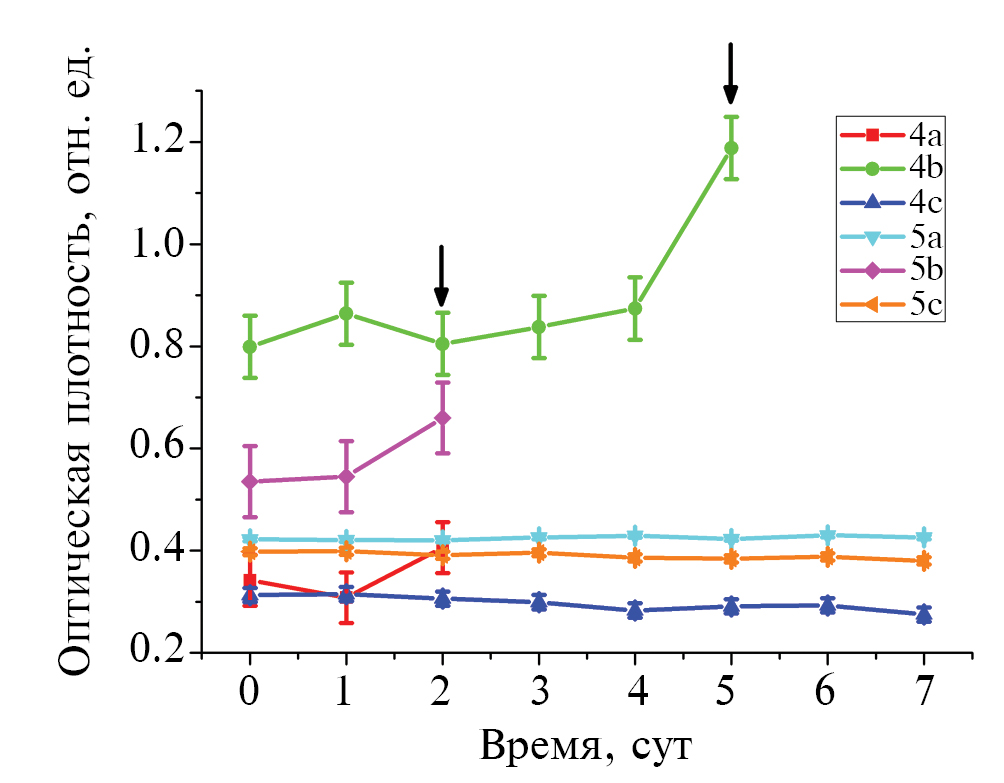 Рис. 1. Изменение оптической плотности липосомальных суспензий (амфифил: PC: Chol 5:5:3 масс.%) при хранении при комнатной температуре. Черными стрелками обозначены временные точки начала агрегации липосом на основе соединений 4а, 4b и 5b.