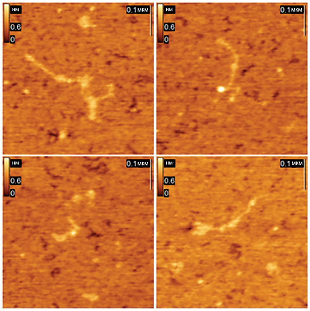 Рис. 2. Подборка АСМ-изображений молекул РНК (Type VI from Torula yeast), адсорбированных на поверхности слюды.