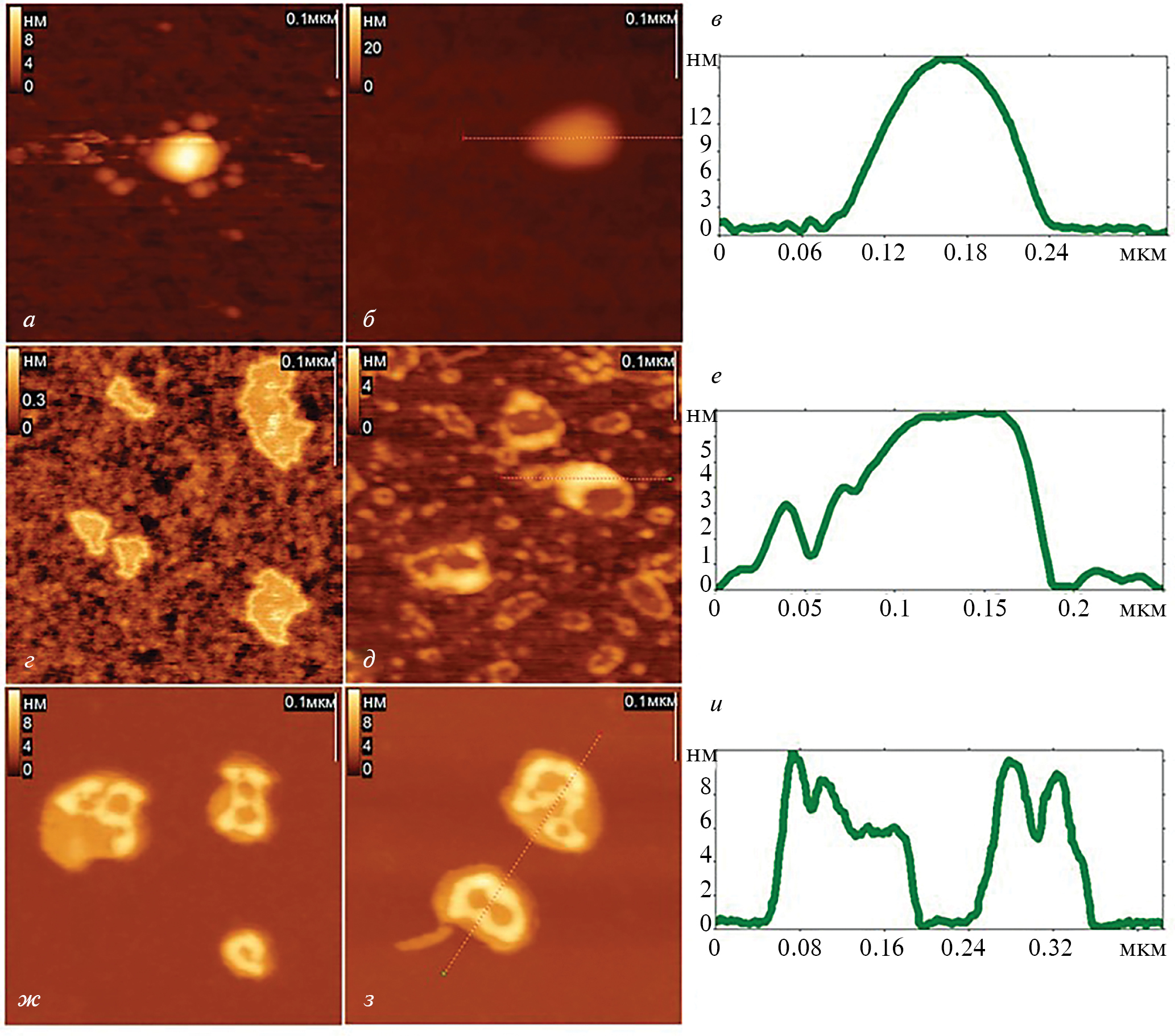 Рис. 3. а-б, г-д, ж-з – АСМ-изображения комплексов РНК с липосомами на основе 4а (а-б), 5а (г-д) и 5с (ж-з), нанесенных на поверхность слюды. в, е, и – Вертикальный профиль поверхности, проведенный вдоль линий на соответствующих АСМ-изображениях (б, д, з). Размеры изображений 500 × 500 нм2 (а-б, д, ж-з) и 300 × 300 нм2 (г).