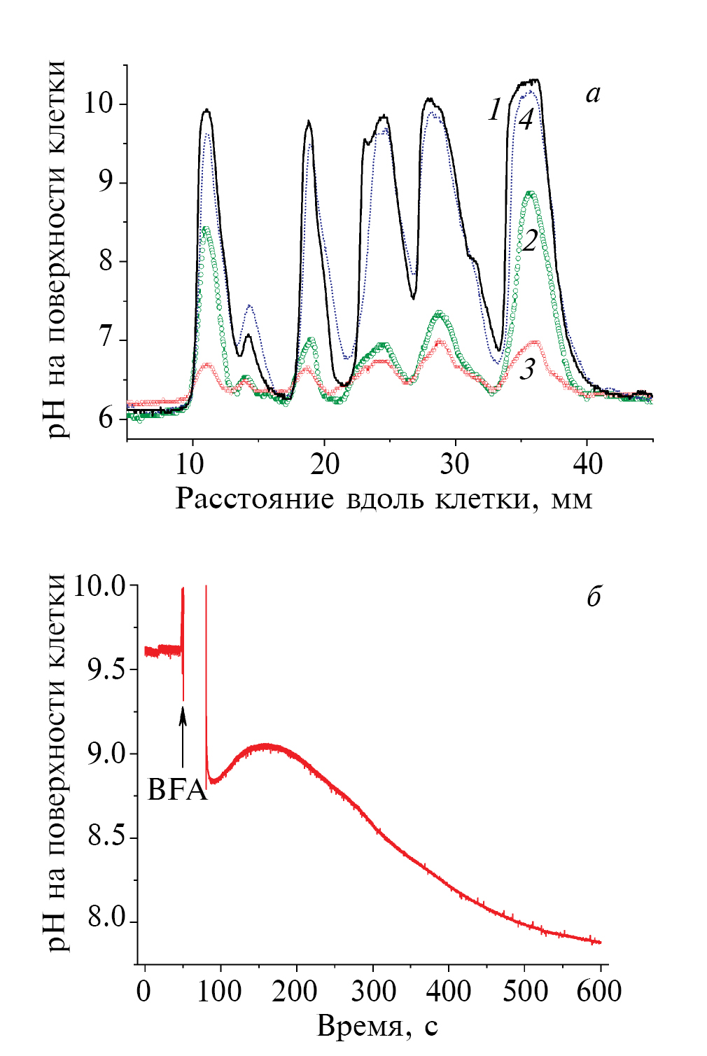 Рис. 1. Светозависимый профиль рН в примембранных слоях среды (рНо) по длине интернодальной клетки Chara и чувствительность наружных щелочных зон к возбуждению плазмалеммы и ингибитору внутриклеточного везикулярного транспорта брефелдину А. а – Профили рНо в покое (сплошная кривая 1), а также через 2, 9 и 45 мин после генерации ПД (кривые 2–4 соответственно). б – Снижение рНо в щелочной зоне освещенной клетки после замены искусственной прудовой воды на аналогичный раствор с добавлением 70 мкМ брефелдина А (BFA); интенсивность света – 25 мкмоль/(м2 с).