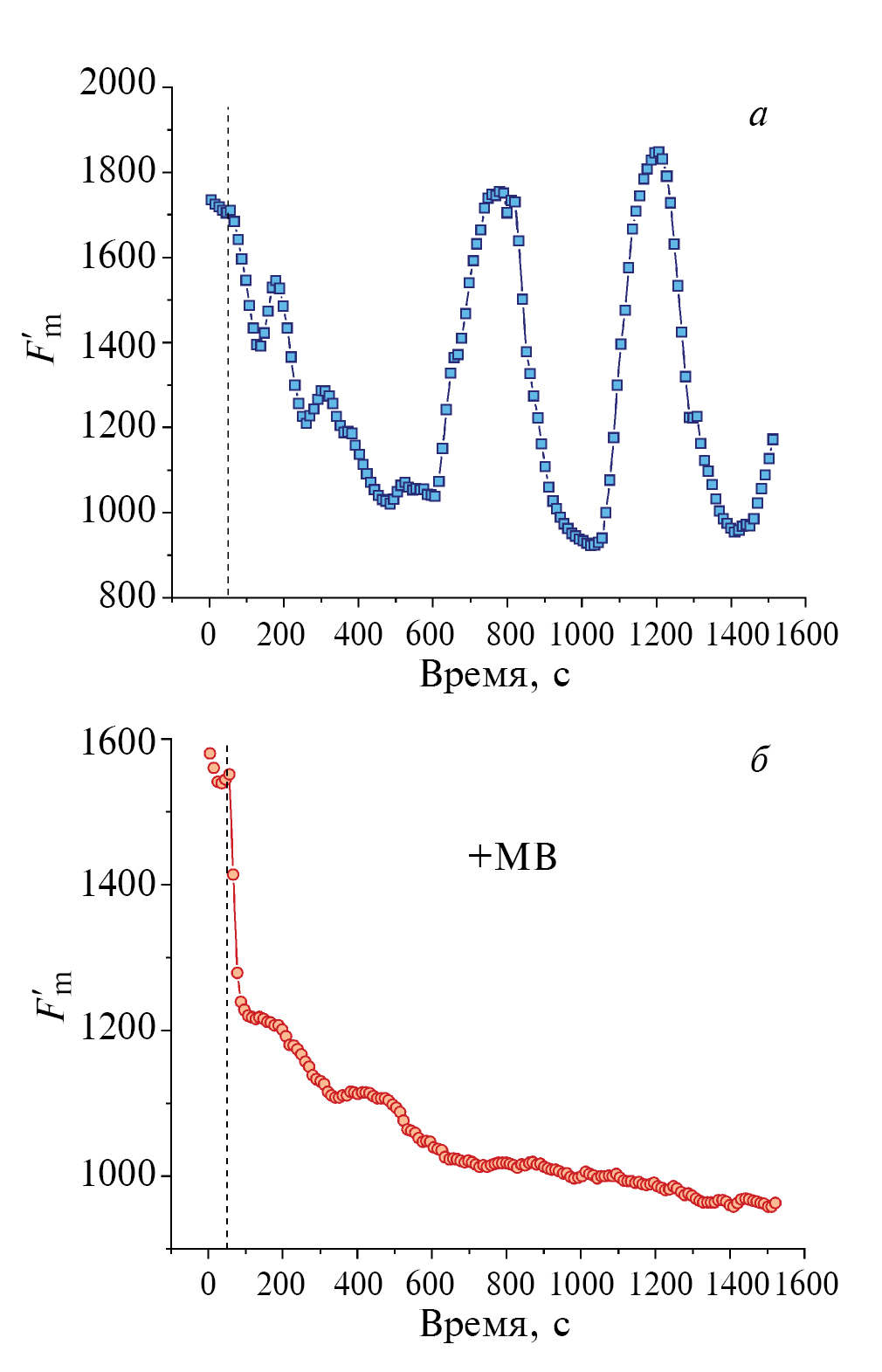 Рис. 3. Генерация ПД в стандартных условиях (интенсивность света 39 мкмоль/(м2 с)) индуцирует (а) длительные периодические колебания флуоресценции Fm′, но вызывает (б) устойчивое тушение Fm′ при наличии в среде 0.5 мМ метилвиологена (МВ). Момент генерации ПД отмечен вертикальными штриховыми линиями при t = 50 с.