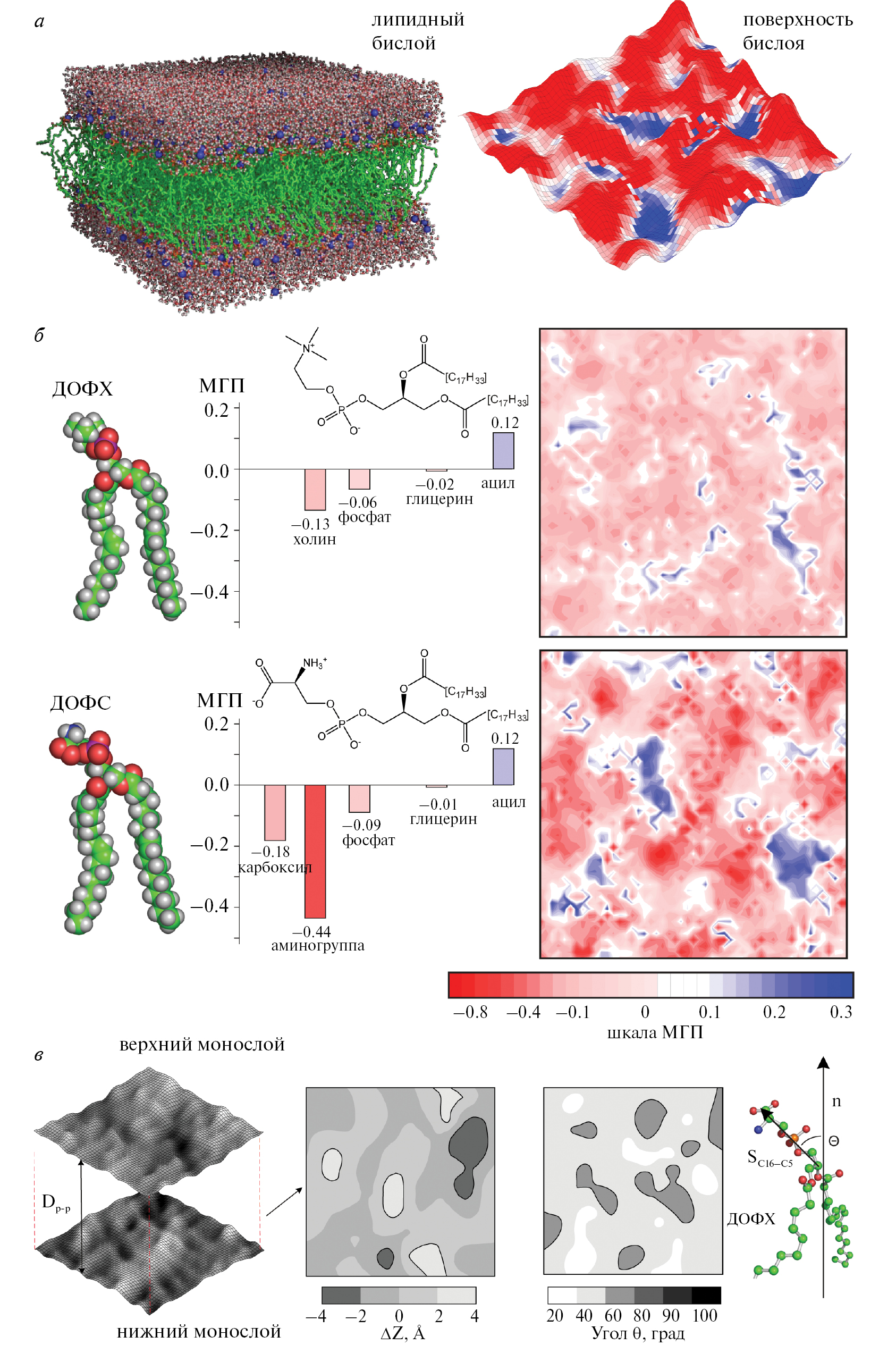 Рис. 1. Неоднородная организация липидного бислоя. а – Полноатомная структура липидного бислоя и поверхность бислоя, окрашенная по МГП (см. далее). б – Двумерные карты поверхности бислоев ДОФХ и ДОФС, окрашенные в соответствии со значениями МГП (красным и синим цветом показаны гидрофильные и гидрофобные участки поверхности). Полноатомные модели структуры бислоев получены в расчетах МД. Подробнее см. [24]. в – Картирование ландшафта бислоя и угла наклона полярных головок по отношению к нормали к плоскости бислоя.