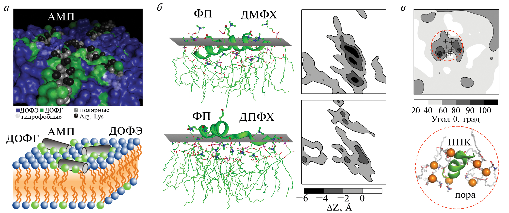 Рис. 2. Примеры МО в процессе взаимодействия МАП с модельными бислоями в ходе расчетов МД. а – Кластеризация анионных ФГ липидов (показано зеленым цветом) в «крупнозернистой» мембране ФЭ/ФГ при связывании АМП Ltc1. б – Модуляция ландшафта полноатомных бислоев ДМФХ и ДПФХ при взаимодействии с ними пептида слияния (ФП) из гемагглютинина вируса гриппа. в – Нарушение упаковки полярных головок ФС при связывании с пептидом-переносчиком (ППК) пенетратином.