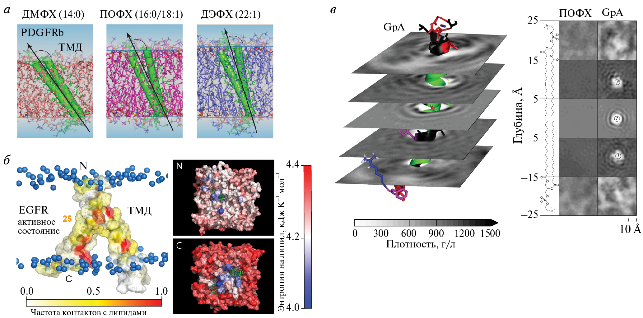Рис. 3. Мембранный ответ в присутствии ТМД, наблюдаемый в ходе расчетов МД. а – Изменение угла наклона димера ТМД рецептора PDGFRb по отношению к нормали бислоя в зависимости от состава ацильных цепей (толщины гидрофобного слоя). б – Ограничение конфигурационной динамики липидных молекул ПОФХ в результате взаимодействия с димером ТМД рецептора EGFR. Поверхность ТМД окрашена в соответствии со значениями частоты липидных контактов в процессе МД (около 25 связанных молекул). Поверхность бислоя раскрашена в соответствии со значениями конфигурационной энтропии липидных молекул. в – Картирование неоднородности плотности липидных молекул ПОФХ вблизи мономерного ТМД гликофорина-А (GpA). Показаны двумерные карты плотности, полученные для срезов на разной глубине бислоя.