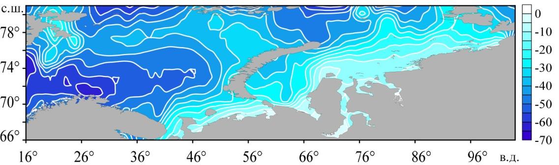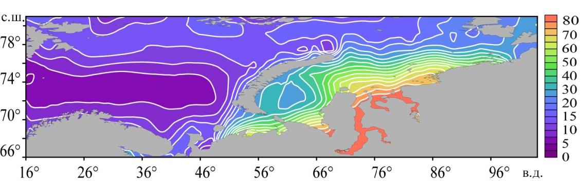 Рис. 10. Среднемноголетнее распределение глубины залегания максимума амплитуды вертикальной составляющей скорости первой моды ВВ (м) в морях Баренцевом и Карском в июле, λ = 1000 м
