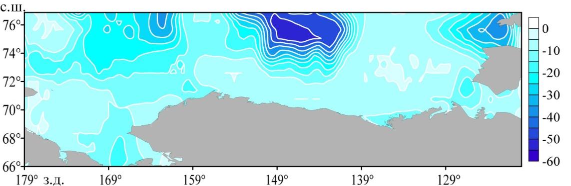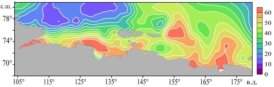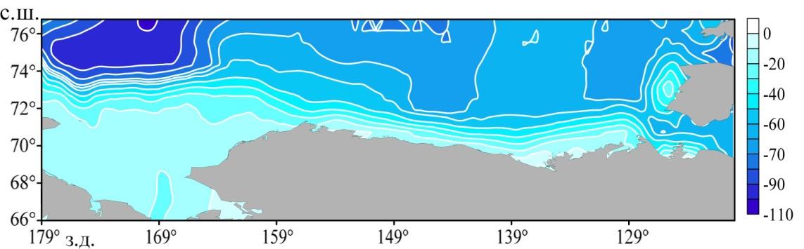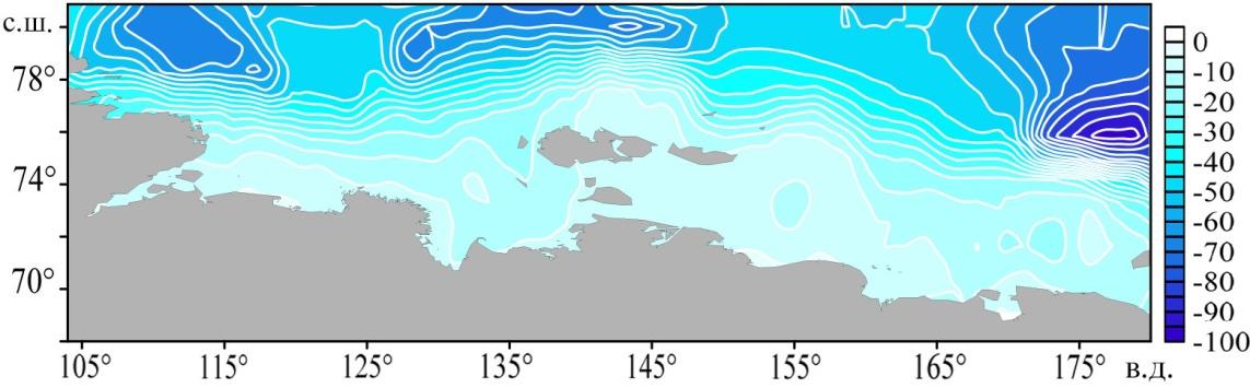 Рис. 14. Среднемноголетнее распределение глубины залегания максимума амплитуды вертикальной составляющей скорости первой моды ВВ (м) в морях Чукотском и Бофорта в июле, λ = 1000 м