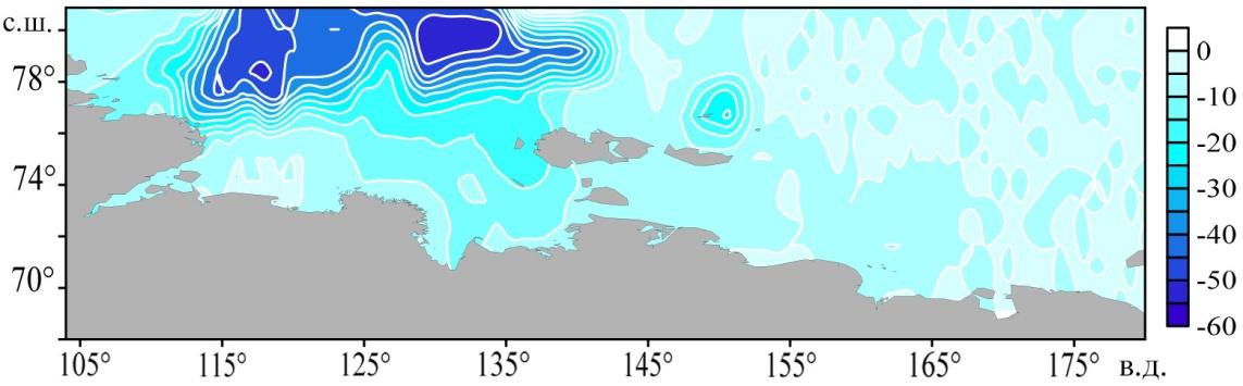 Рис. 12. Среднемноголетнее распределение глубины залегания максимума амплитуды вертикальной составляющей скорости первой моды ВВ (м) в морях Лаптевых и Восточно-Сибирском в июле, λ = 1000 м