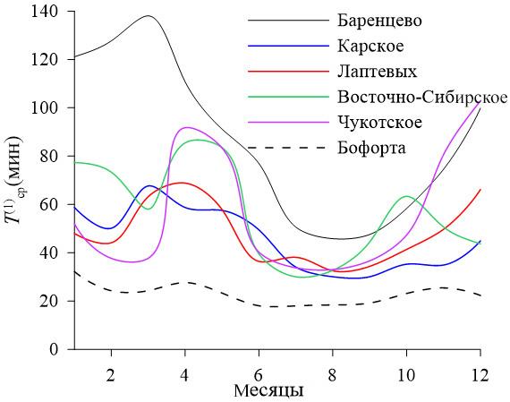 Внутригодовой ход осредненных по площади моря периодов первой моды ВВ приведен на рис. 8. Значения периодов представлены для длины волны 1000 м (), однако качественно график будет иметь такой же вид и для других длин волн из рассматриваемого диапазона [8, 9]. Из рис. 3, а и рис. 8 видно, что ВВ с наименьшими периодами (наибольшими частотами) наблюдаются в месяцы максимальных градиентов плотности. Коэффициент корреляции (R) между внутригодовыми циклами Nmax(z)ср и находится в интервале от –0,83 до –0,95 [8]. Самые короткопериодные ВВ наблюдаются в июле – сентябре, в месяцы максимальной (летней) стратификации вод. Минимальное значение в Баренцевом море составляет ~ 45 мин, в морях Карском, Лаптевых, Восточно-Сибирском и Чукотском ~ 30 мин, в море Бофорта ~ 20 мин. Максимальные значения осредненного собственного периода