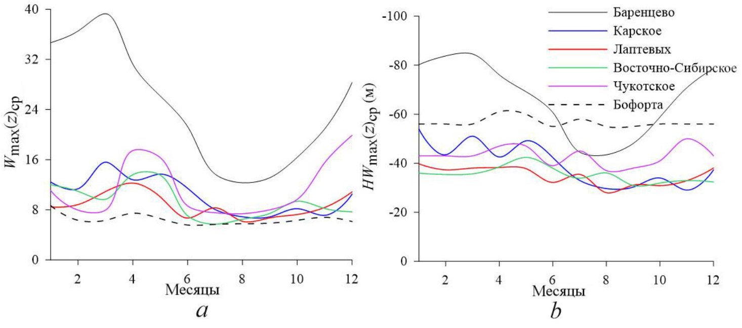 Для анализа вертикальной структуры ВВ в каждом узле сетки рассчитывались профили амплитуды вертикальной составляющей скорости первой моды ВВ, определялись максимум W(1)(z) (Wmax(z)) и глубина его залегания (HWmax(z)). На рис. 9–14 представлено среднемноголетнее распределение Wmax(z) и HWmax(z) в исследуемых морях в июле. Полученные для каждого месяца значения Wmax(z) и HWmax(z) осреднялись по акваториям морей (Wmax(z)ср, HWmax(z)ср) (рис. 15, а, b). Получено, что наибольшие значения Wmax(z)ср (более интенсивная волновая динамика) наблюдаются в месяцы наименьших градиентов плотности: в Баренцевом и Карском морях – в марте, в морях Лаптевых, Восточно-Сибирском и Бофорта – в апреле, в Чукотском – в апреле и декабре. Коэффициент корреляции между внутригодовыми циклами Nmax(z)ср и Wmax(z)ср составляет от –0,73 до –0,95 [8]. Весной и летом тающие льды, впадающие реки приносят большое количество пресной воды, снижая соленость поверхностных слоев морей, увеличивая градиент плотности в районах стока рек и таяния льда. Там же наблюдаются минимальные значения амплитуды вертикальной составляющей скорости. Опресненные воды образуют своего рода «крышку», которая мешает перемешиванию верхних и нижних слоев, препятствует развитию внутренних волн.