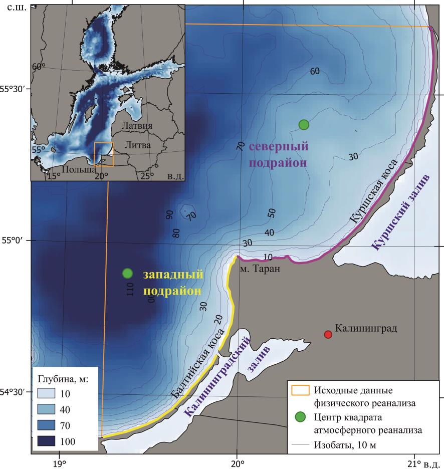 Оценка пространственной изменчивости и количественных характеристик повторяемости температурных аномалий, идентифицируемых как поверхностное проявление апвеллингов, проводилась по среднесуточным данным о температуре воды с пространственным разрешением 4 км на глубине 1,5 м с июня по август в 2000–2019 гг. Данные получены из массива физического реанализа Балтийского моря (CMEMS) 1. Участки акватории в прибреж-ной зоне, температура в которых была на 1°C ниже фоновых значений для выделенного района открытого моря, отмечались как зоны апвеллингов (подробнее метод описан в [2]). За событие апвеллинга принималось наличие ячеек отрицательной аномалии температуры в прибрежной зоне продолжительностью от одних суток площадью от одной ячейки. С применением данной методики были идентифицированы даты и области апвеллингов для акватории ЮВБ, ограниченной координатами 19,236–21,200° в. д., 54,300–55,725° с. ш. (рис. 1) по двум подрайонам: западному (западное побережье Калининградской области и побережье Балтийской (Вислинской) косы) и северному (северное побережье Калининградской области и побережье Куршской косы).