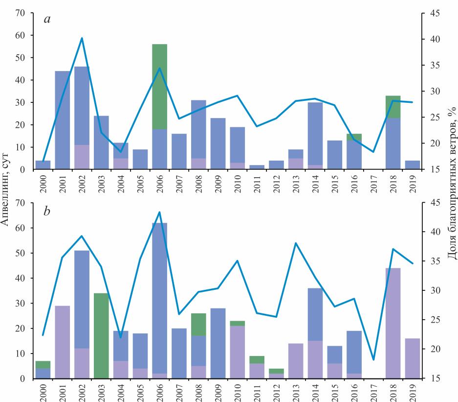 Рис. 4. Межгодовая изменчивость повторяемости экмановских (сиреневые столбики), сгонных (синие столбики) и смешанных (зеленые столбики) апвеллингов и благоприятных ветров (синяя кривая) в западном (a) и северном (b) подрайонах