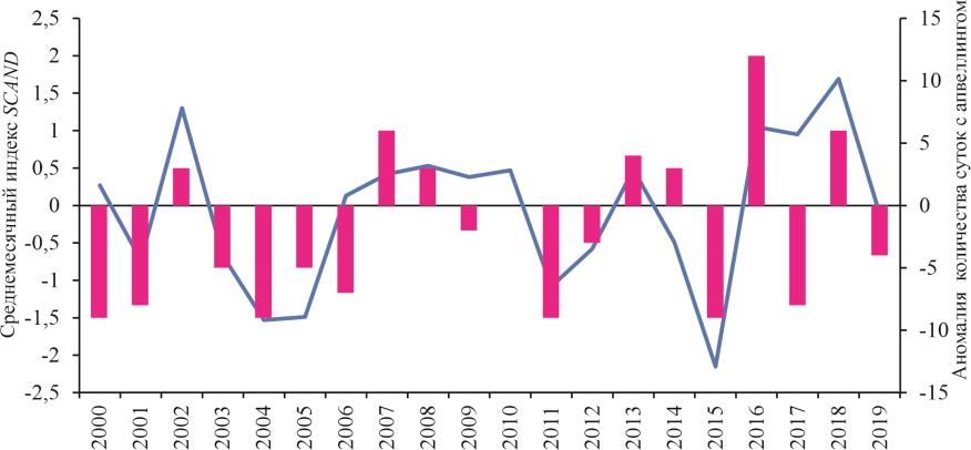 Как отмечалось ранее [12], изменение ветрового режима в регионе Балтийского моря может быть связано с изменчивостью индексов крупномасштабной циркуляции. В частности, индекс SCAND отражает интенсивность развития антициклонической деятельности над Скандинавским п-овом, блокирующей зональный перенос, что в его положительной фазе приводит к усилению ветров северных румбов над акваторией Балтийского моря и, соответственно, – к увеличению количества апвеллингов в ЮВБ. В период 2000–2019 гг. индекс изменяется в пределах –2,33 … 2,48, при этом в 2010–2019 гг. его отрицательная фаза наблюдается чаще.
