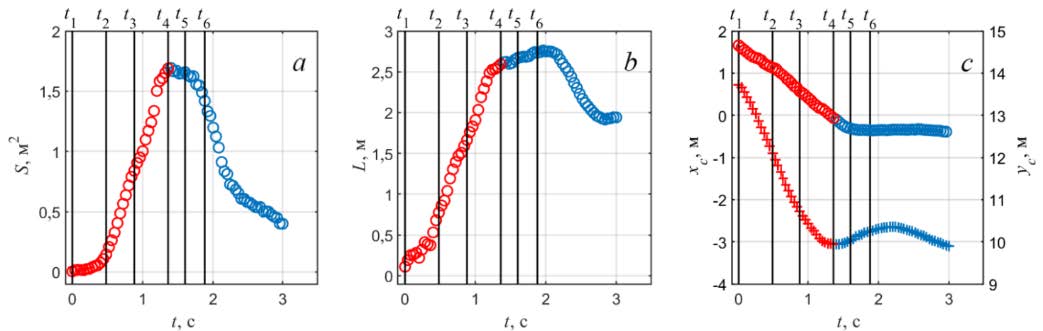 На рис. 3 демонстрируется характерный временной цикл площади, длины гребня и координат геометрического центра обрушения. Вертикальные прямые линии последовательно соответствуют кадрам, приведенным на рис. 2. Как следует из рис. 3, а, на начальном этапе площадь пенной области увеличивается и в момент начинает уменьшаться, что указывает на окончание активной фазы, и при преимущественный вклад в формирование пенной структуры начинает вносить остаточная пена.