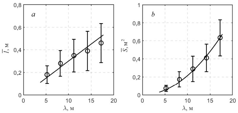 Рассмотрим зависимость малой оси барашка и его площади от . Диапазон длин обрушивающихся волн 3,7–18,7 м разбивался на 5 интервалов с шагом = 3 м. В каждом из диапазонов определялось среднее значение и , а значение длины обрушивающейся волны соответствовало середине интервала .