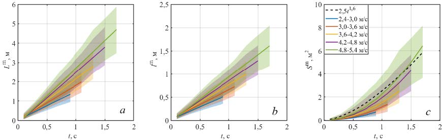 Временная эволюция кинематических характеристик барашка , и для каждого из выбранных диапазонов скоростей представлена на рис. 5. Для лучшей визуализации интервалы изменения значений длин и площадей обрушений для каждого диапазона показаны цветными областями. Верхние и нижние границы областей определены как , и , где , , – среднеквадратические отклонения случайных значений длин и площадей обрушений в момент . Зависимости и от времени на рис. 5, a, b близки к линейным, в то время как близка к степенной. Из рис. 5 следует, что чем больше скорость обрушивающейся волны и, следовательно, ее масштаб, тем быстрее увеличиваются геометрические размеры барашка.