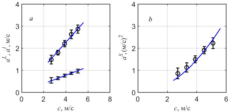 Зависимость полученных коэффициентов и от средней скорости обрушения в интервалах демонстрируется на рис. 6, где вертикальные отрезки соответствуют значениям среднеквадратических отклонений . Линиями показаны рассчитанные методом наименьших квадратов зависимости