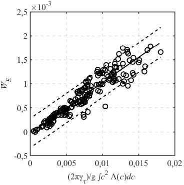 Сопоставим значения WE, измеренные в эксперименте, и WA, рассчитанные по формуле (6) на основе одной и той же базы данных. Значения WE определялись как средняя площадь регистрируемых обрушений на единице морской поверхности, что является традиционным методом, применяемым в многочисленных экспериментальных исследованиях: