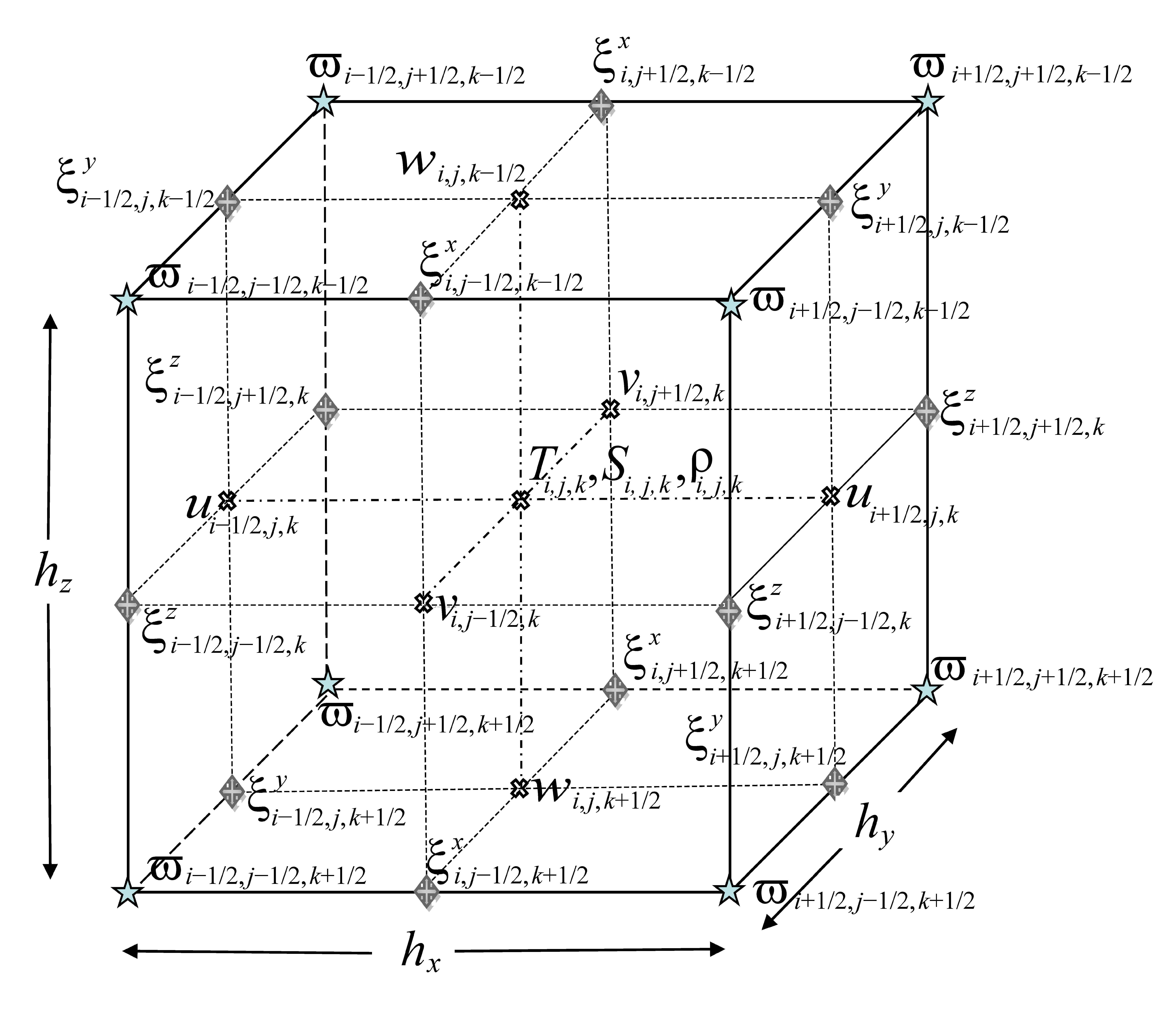 F i g. 1. Distribution of variables in box (i, j, k). At the box vertices indicated by an asterisk, PV (ω) is determined, and at its edges – the components of absolute vorticity