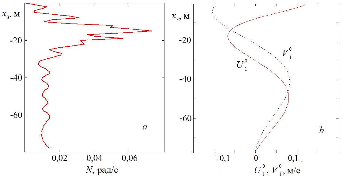 Зависимость частоты Брента – Вяйсяля от вертикальной координаты показана на рис. 2, а, двух компонент скорости течения – на рис. 2, b.