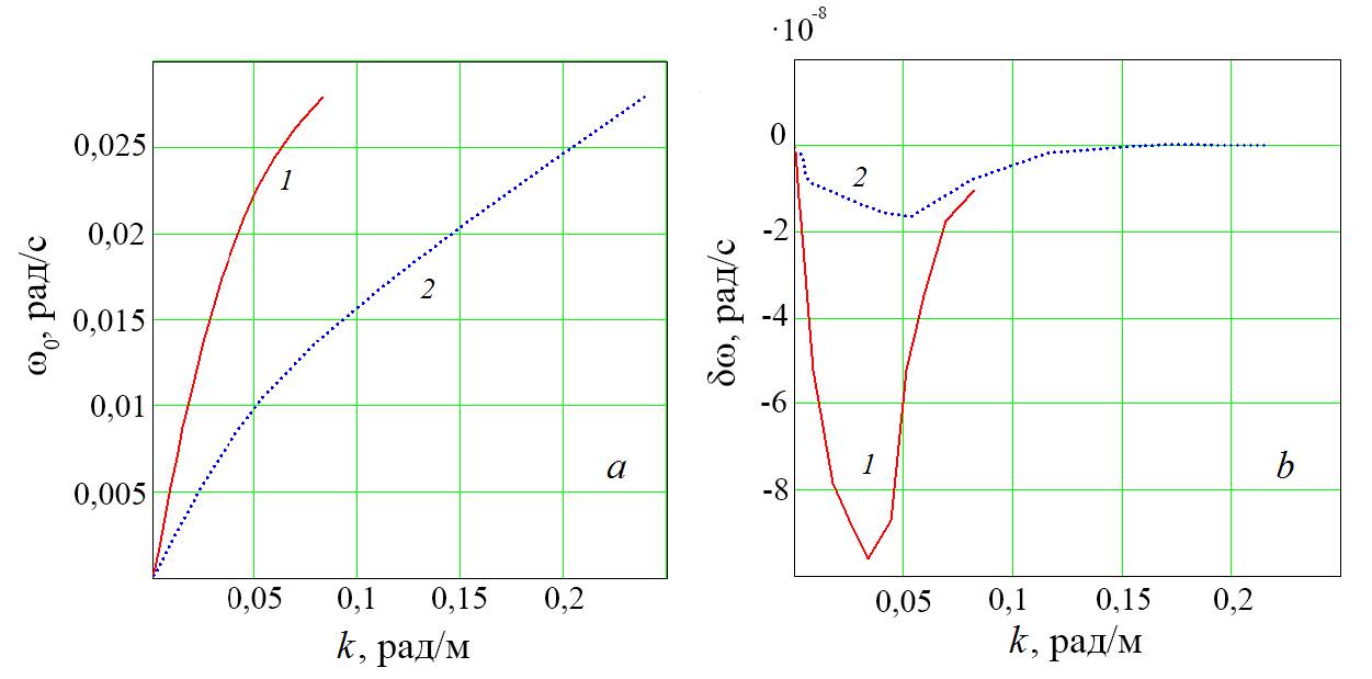 F i g. 3. Dispersion curves (a) and graphs of the frequency imaginary part (b) of the first (1) and the second (2) modes