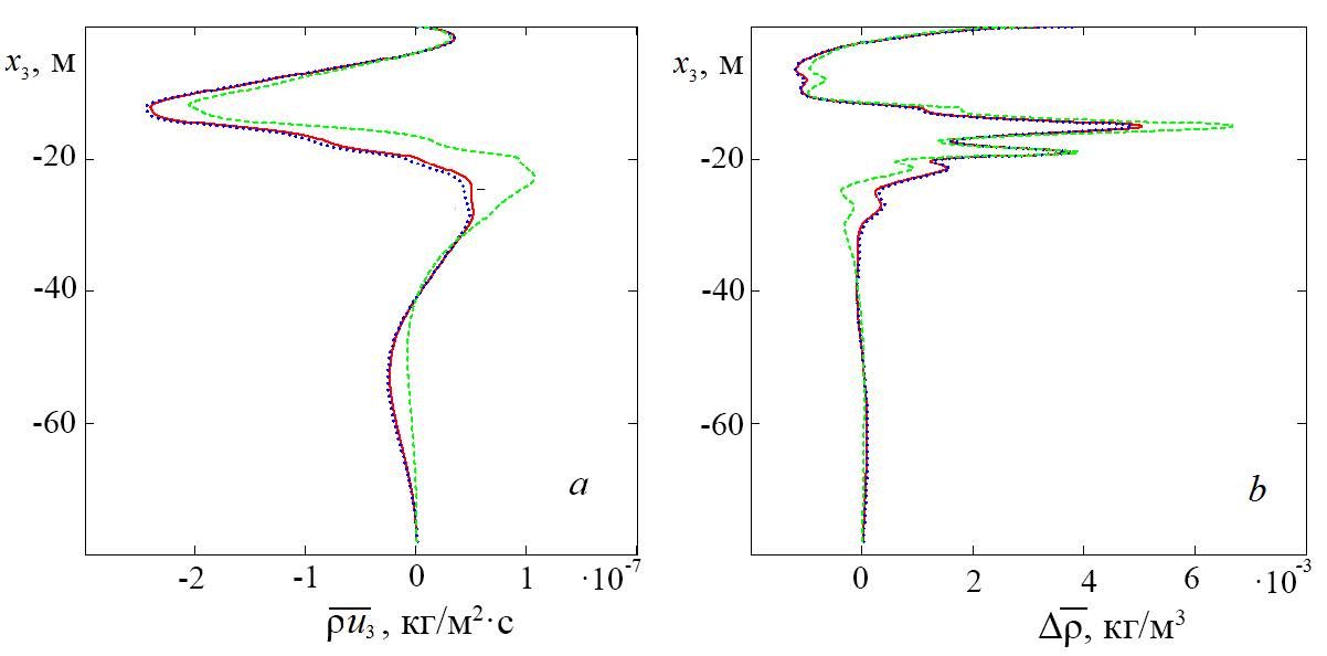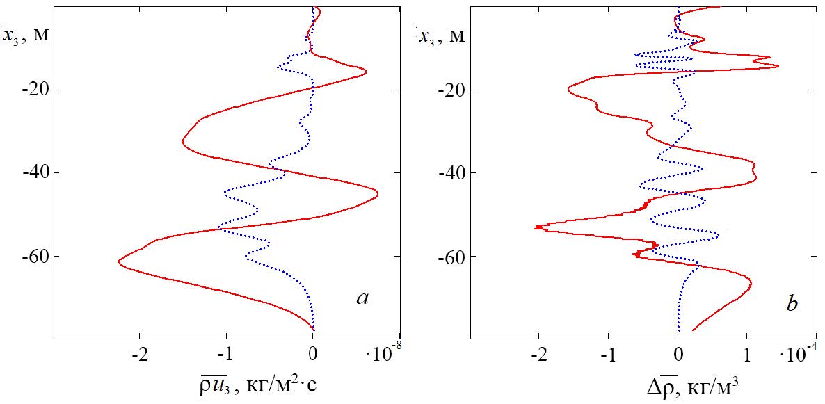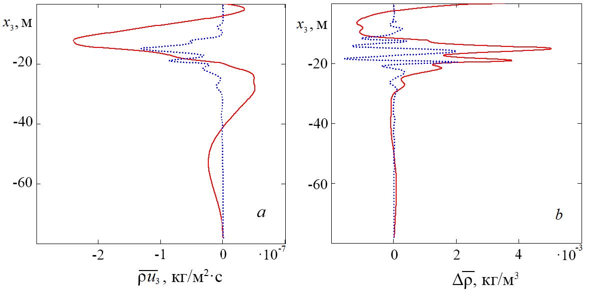 Вертикальный волновой поток массы у первой моды значительно преобладает в верхнем 40-метровом слое, в то время как на больших глубинах волновые потоки первой и второй мод сопоставимы по абсолютной величине. Интенсивность генерируемой вертикальной тонкой структуры поля плотности у первой моды больше, чем у второй при той же максимальной амплитуде волны.
