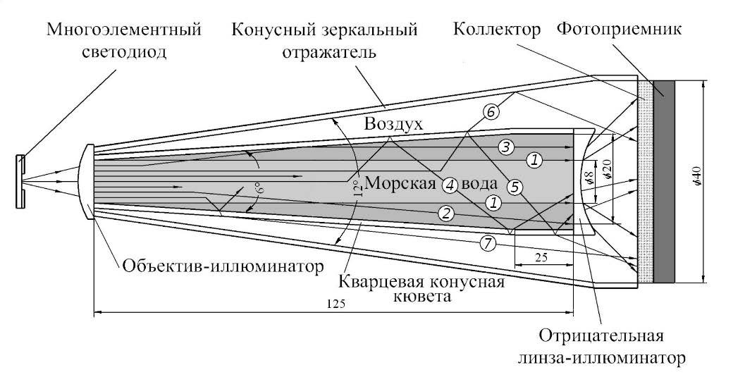 Ход лучей в конусной кювете характеризуется тем, что для прямо прошедшего через водную среду светового потока все происходит так же, как и в цилиндрической кювете. Однако в конической кварцевой кювете значительно больше рассеянных под малыми углами фотонов достигают коллектора без соприкосновения со стенками. За счет этого уменьшается влияние стенки кюветы на определение поглощения света в море, поскольку в природных водах рассеяние происходит в основном в малых углах и практически все они перенаправляются к коллектору без взаимодействия со стенками.