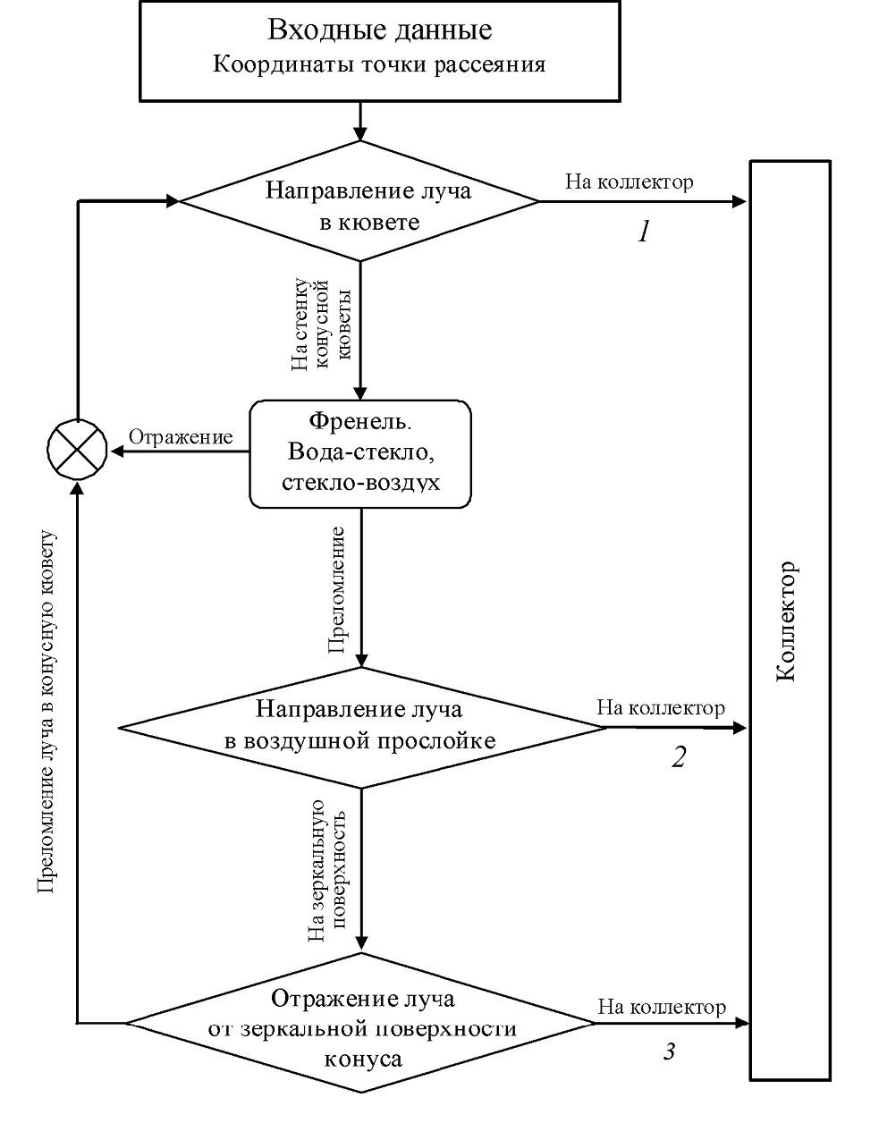На рис. 2 показана блок-схема алгоритма расчета эффективного коэффициента отражения и геометрических параметров хода лучей, рассеянных слабо поглощающей водной средой в кварцевой конусной кювете на воздухе.