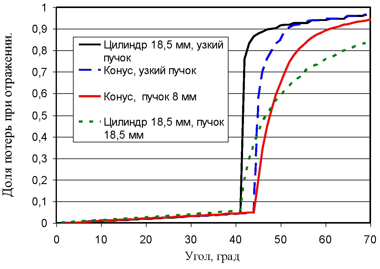 Во избежание многократного дублирования лучей малой интенсивности считалось, что свет, зеркально отраженный в направлении кварцевой конусной кюветы, проникает в среду с коэффициентом пропускания, равным единице. Относительная ошибка данного упрощения оценивается в 5%. Дальнейший расчет коэффициентов Френеля для таких лучей проводился по упрощенной схеме, а именно: из отраженного и преломленного луча выбирался луч большей интенсивности. Соответствующий коэффициент Френеля приравнивался к единице. Для заданного угла рассеяния проводилось интегрирование по двум пространственным координатам и азимуту. Потери света в данной схеме могут быть связаны только с отражением луча в направлении источника света и с поглощением света при зеркальном отражении от внешнего конусного зеркального отражателя.