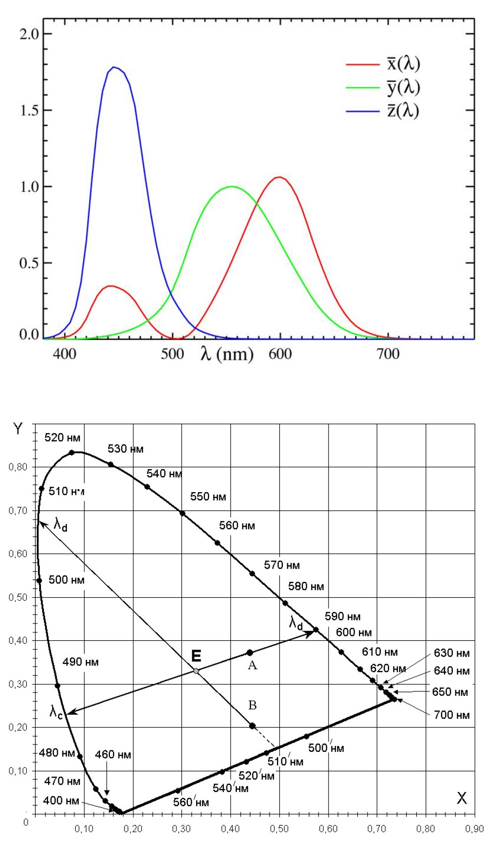 Рис.1. Функции спектральной чувствительности для стандартного наблюдателя согласно CIE 1931 [1] (сверху); цветовой треугольник в координатах x, y 6 (снизу): точка E – белый цвет; точки А и В – некоторые произвольные цвета; λd – положение доминирующей длины волны