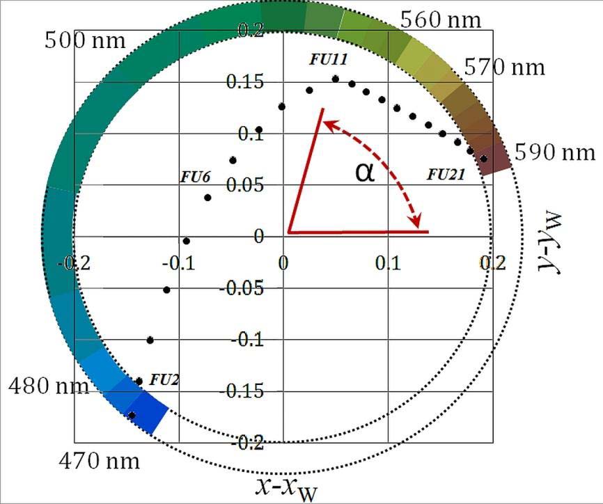 Рис.2. Диаграмма цветности, показывающая соответствие угла оттенка цвета α точке белого цвета (xw, yw) шкалы цветов FU (Фореля – Уле). Доминирующая длина волны конкретного сегмента указана в нанометрах [2, c. 25667]