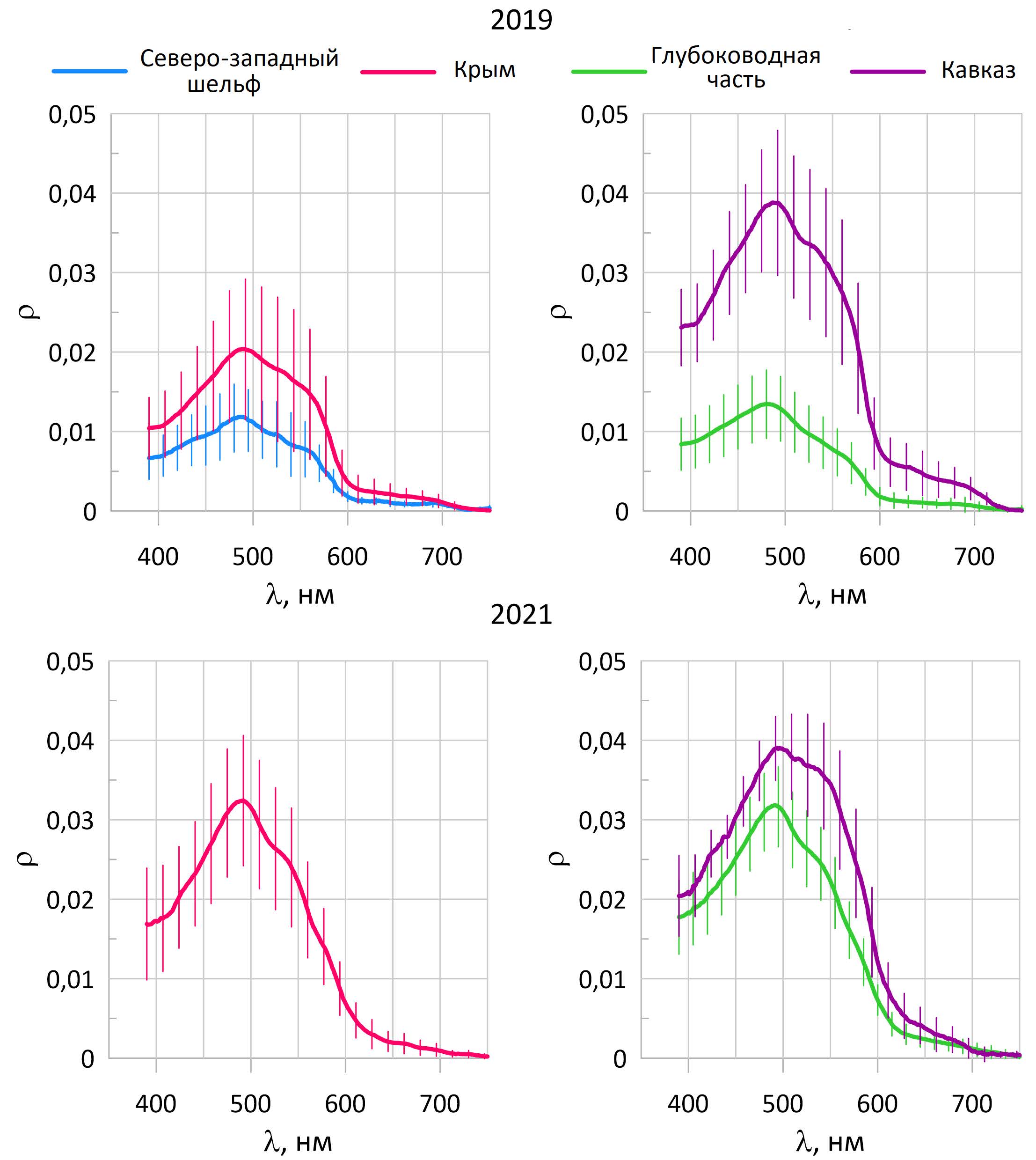 В 2021 г. значения КЯ изменялись незначительно во всей области исследования. Различие между глубоководной и прибрежными частями как по форме спектров, так и по величинам КЯ практически отсутствовало. Исключение составили значения КЯ в районе Феодосийского залива. Разброс максимальных значений наблюдался от 0,05 в заливе до 0,02 на шельфе за пределами залива. Вдоль Кавказского побережья также зафиксированы наибольшие значения КЯ, обусловленные речным стоком – известным источником поступления взвешенных веществ. В целом значения КЯ в 2021 г. были выше, чем в 2019 г.