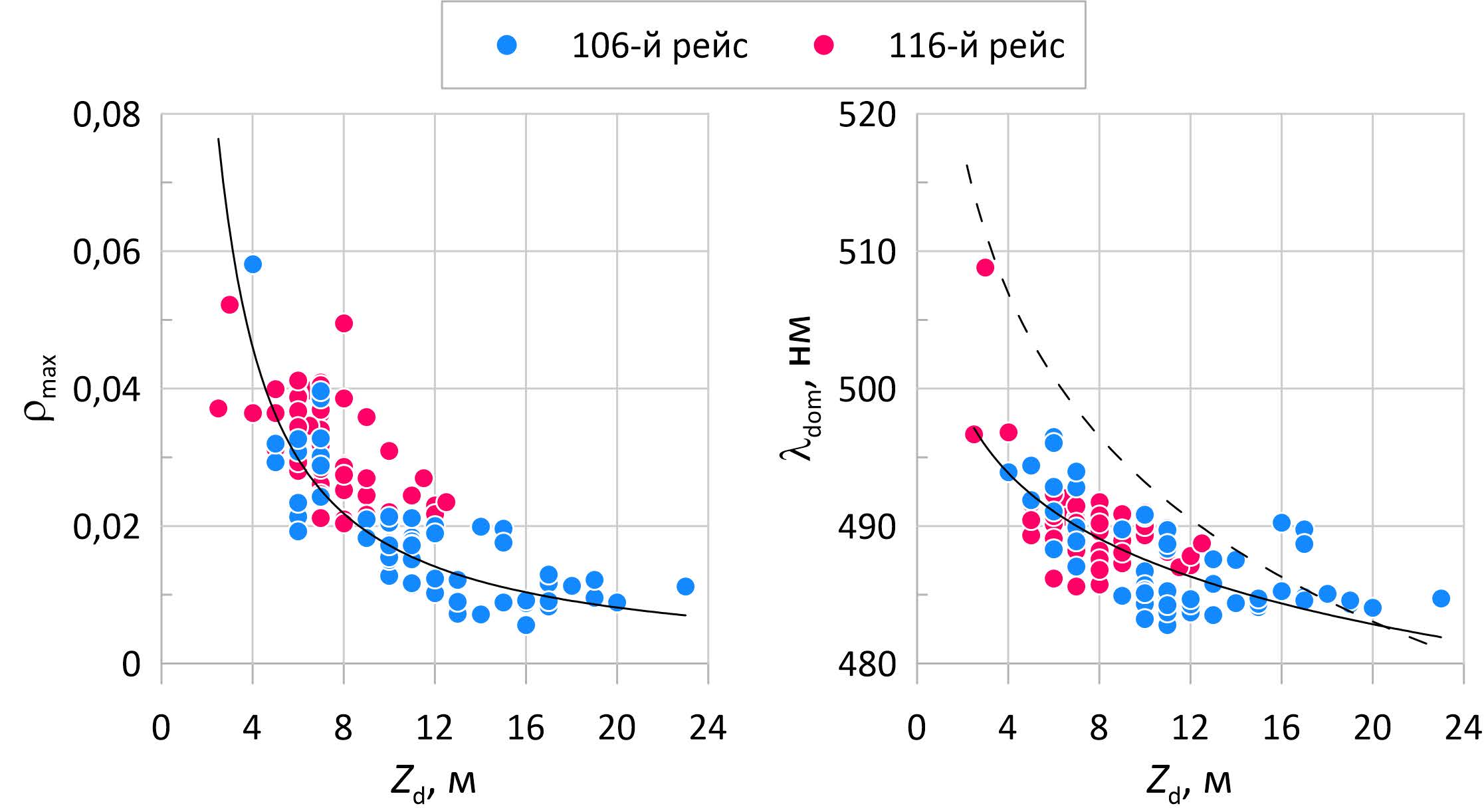 В работе [13] по измерениям в водах Тропической Атлантики получена формула связи λdom = f(Zd) для значений Zd в диапазоне 10–41 м: