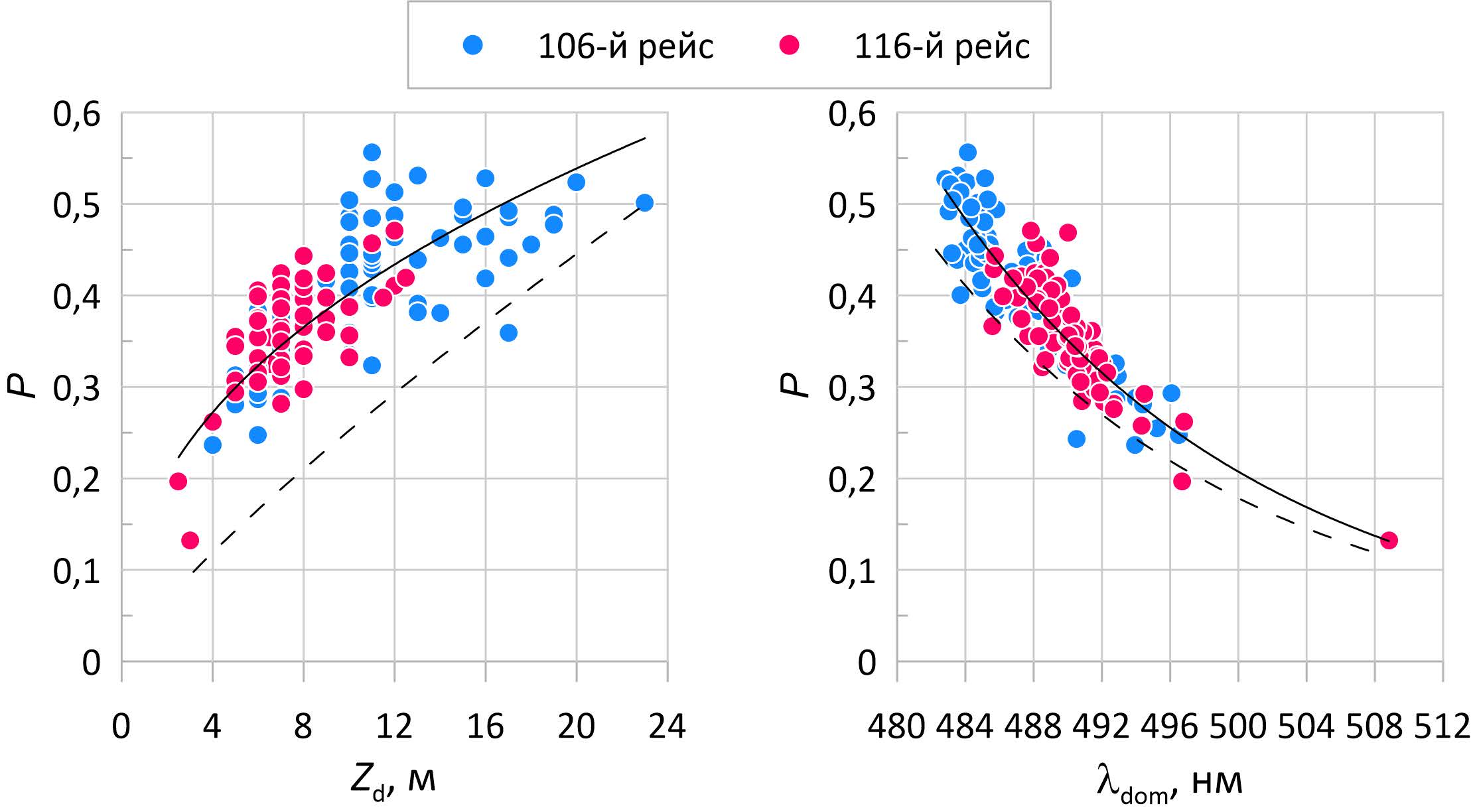 На графике рис. 6, слева хорошо видно различие между расположением наборов точек для двух экспедиций. В 2021 г. (красные точки) концентрация органических частиц взвеси выше, чем в 2019 г. (синие точки), из-за продолжающегося зимне-весеннего развития фитопланктона, что отражается в значениях чистоты цвета – они ниже. При наличии данных о составе и численности фитопланктонного сообщества данный вид связи Р = f(Zd), предположительно, можно использовать для оценки биооптического состояния вод Черного моря.