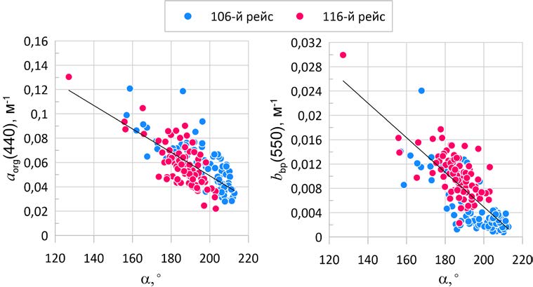 Аппроксимация связи рассеяния назад частицами взвешенного вещества bbp и угла цветности a в водах Черного моря также представляется в виде линейной зависимости (рис. 7, справа)