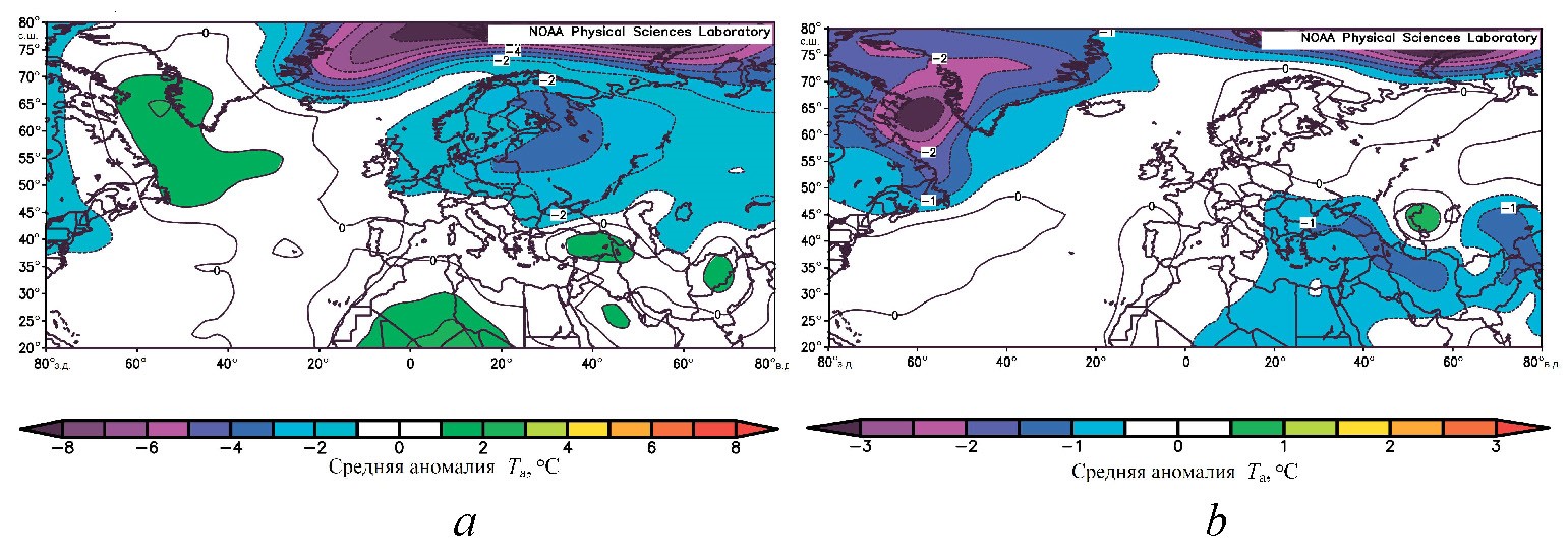 Западная периферия «апеннинского» ядра Азорского антициклона (рис. 2, с) «закачивала» атлантический воздух в высокие широты, формируя там температуру воздуха, близкую к климатической норме. Восточная периферия «апеннинского» ядра Азорского антициклона транспортировала арктический воздух в субтропические широты, формируя в этом регионе отрицательную аномалию приземной температуры воздуха (рис. 3, b).