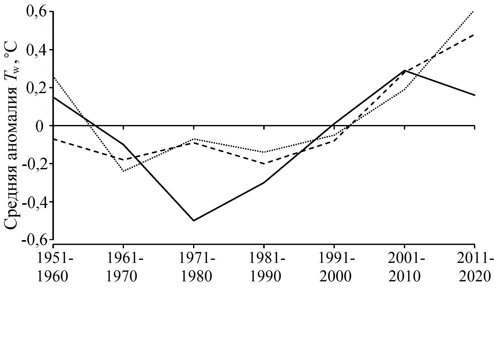 Fig.6. Interdecadal variability of surface temperature anomaly of the North Atlantic (solid line) and surface temperature of the Norwegian (dashed line) and Barents (dotted line) seas