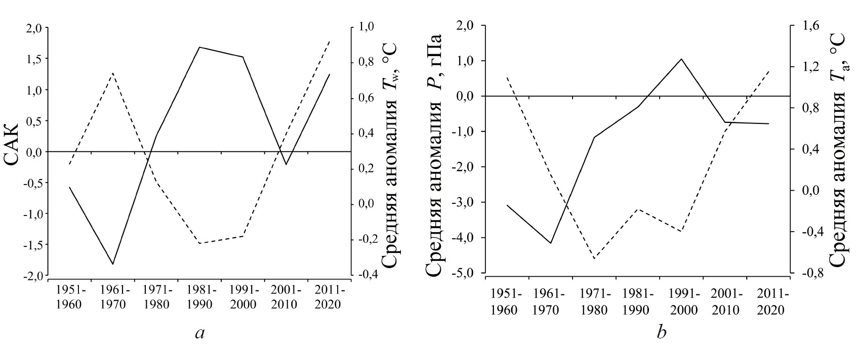 Рис.7. Междесятилетняя изменчивость индекса САК (сплошная линия) и аномалии температуры поверхности моря Тw (штриховая линия) (а), приземного давления (сплошная линия) и призем-ной температуры воздуха Та (штриховая линия) (b) Черного моря