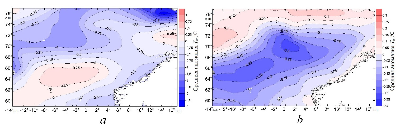 Рис.8. Аномалия температуры поверхности в Норвежском море в десятилетие отрицательных (а) и десятилетие положительных (b) значений индекса САК