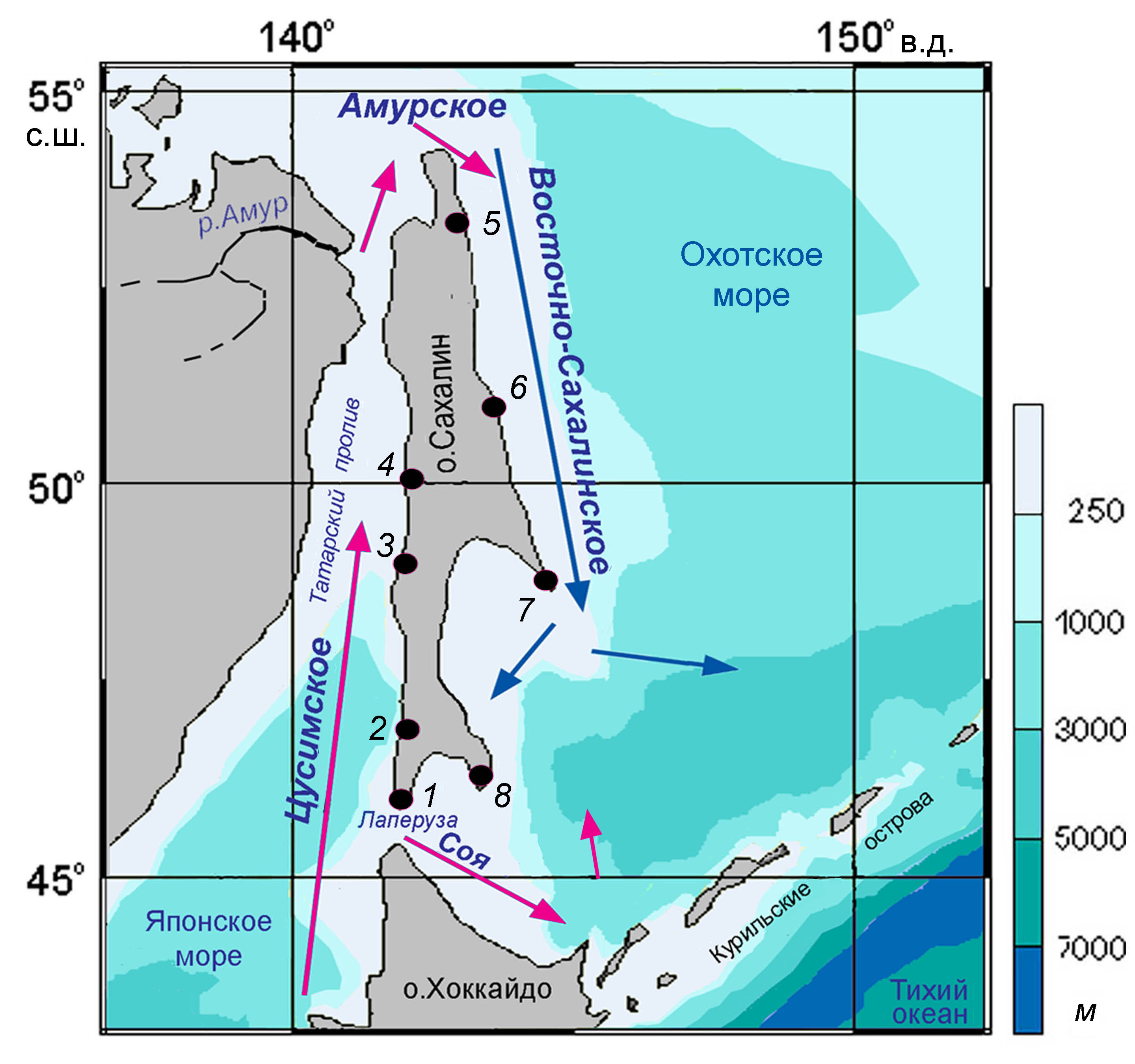 Рис.1. Район исследований. Расположение гидрометеорологических станций (ГМС): 1 – м. Крильон, 2 – Холмск, 3 – Углегорск, 4 – Пильво, 5 – Одопту, 6 – Комрво, 7 – м. Терпения, 8 – Новиково