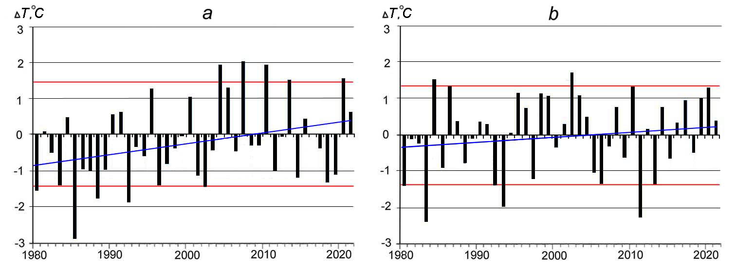 Fig.2. Interannual variability of water temperature anomalies in the western, HMS Holmsk, (a) and eastern, HMS Cape Terpeniya, (b) areas of the Sakhalin shelf (blue lines denote the linear trends, red ones – the criteria of large anomalies)