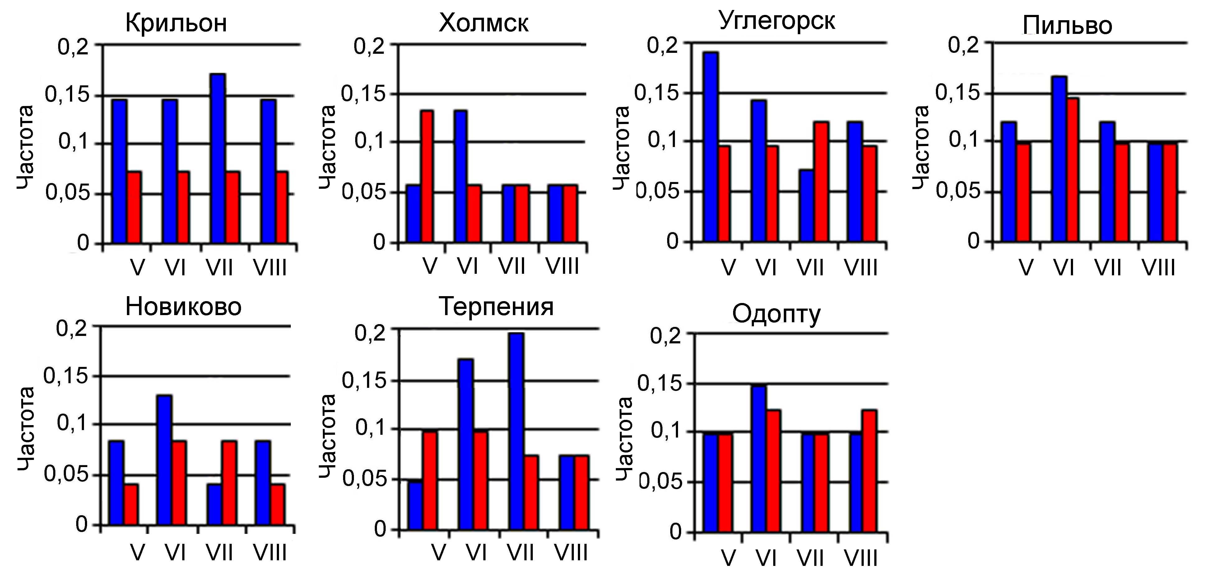 4. Fig. 3. Frequency of arising of strong negative (blue color) and positive (red color) anomalies of water temperature at HMS in May – August, 1980–2021
