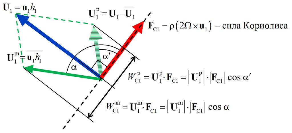 Как видно из рисунка, разделение течений (потоков) на средние (СТ) и пульсационные (МВ) приводит к появлению ненулевых работ силы Кориолиса, с ними связанных. В сумме эти работы равны нулю, т. е. взаимно уничтожаются. Но при разделении уравнений энергетического баланса реальных потоков на уравнения для СТ и МВ соответствующие работы силы Кориолиса должны быть учтены для согласования систем уравнений. Правильно считать эти работы мнимыми (фиктивными), поскольку разделение течений на средние и пульсационные также является мнимым, существующим только в рамках используемого метода представления.
