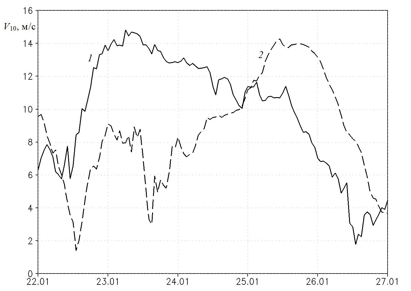 Fig.1. Surface wind speed, m/s, at the points with coordinates 31° E, 44.5° N (1) and 37.5° E, 43° N (2) in January 22–26, 2010. The point positions are shown in Fig. 2