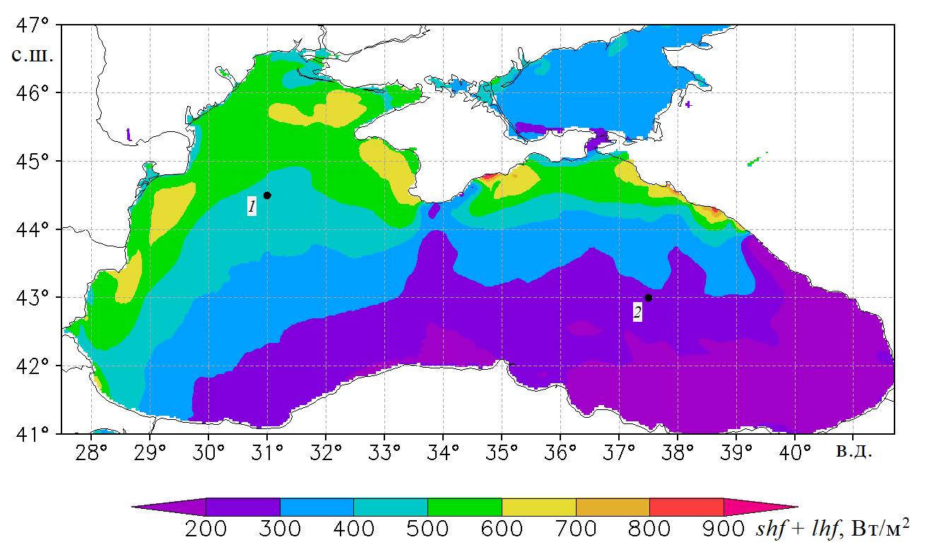 На рис. 1 показаны величины скорости ветра на высоте 10 м в двух точках – в северо-западной и восточной частях моря. На рис. 2 – осредненный за время холодного вторжения (23–25 января) суммарный поток тепла от поверхности, shf + lhf. Хорошо видно, что для всего моря рассматриваемый эпизод действительно можно считать трехсуточным вторжением холодного воздуха. В этот период охлаждение моря было неоднородным: западная и восточная половины моря разделяются небольшой областью уменьшенных потоков, что, естественно, объясняется понижением скорости ветра за подветренным склоном достаточно высоких Крымских гор [13]. При этом теплопотери с поверхности в северной части моря составляли 500–600 Вт/м2, скорость ветра – около 10–14 м/c. В южной половине моря теплопотери через поверхность меньше, поскольку холодный воздух прогревался при движении над более теплым морем.