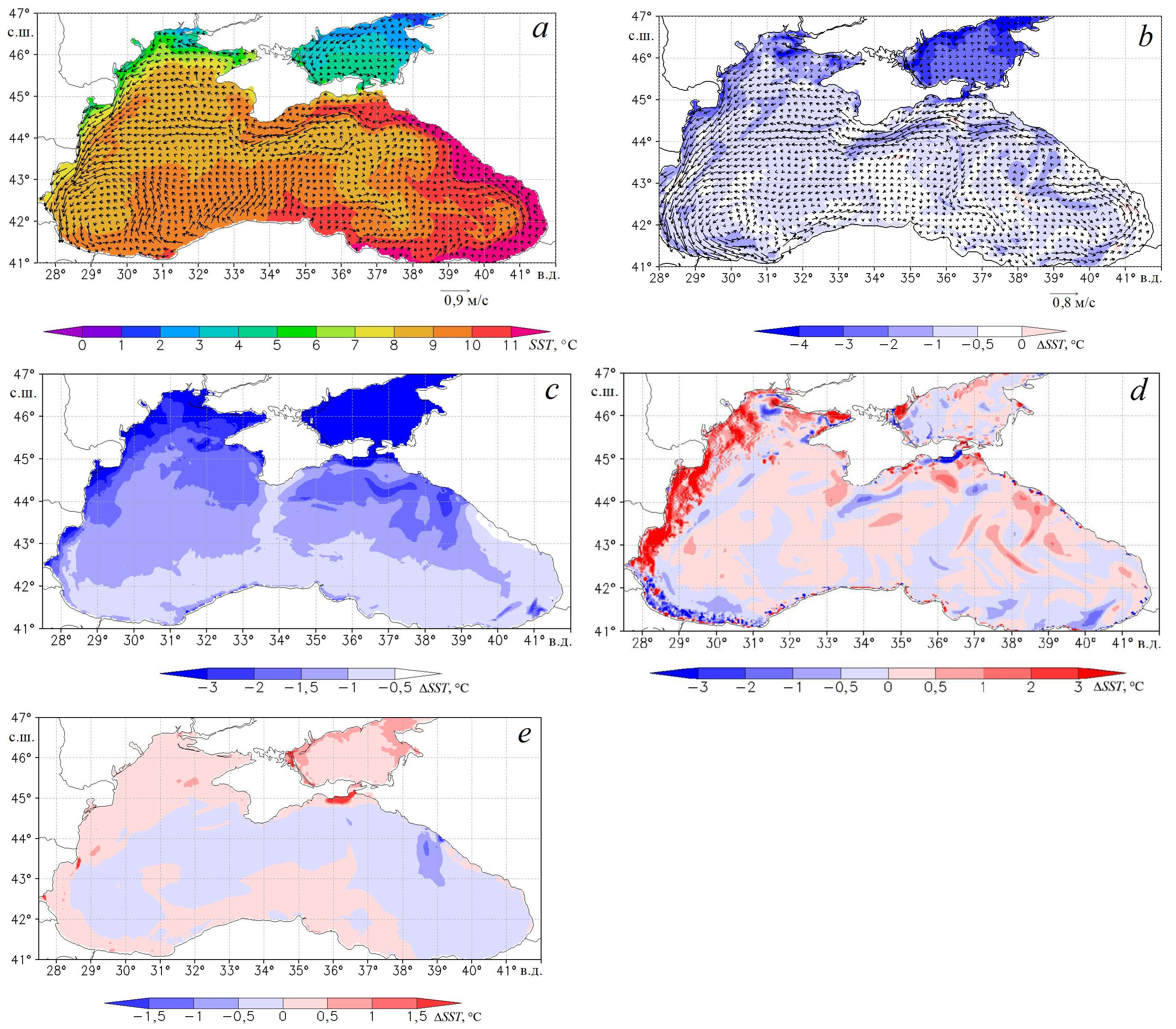 Таким образом, реакция Черного моря на холодное вторжение состояла в уменьшении ТПМ в основном на 1–2 °С под влиянием больших потоков явного и скрытого тепла (рис. 3, с). Влияние горизонтальной адвекции (рис. 3, d) и вертикального турбулентного перемешивания (рис. 3, e) на ТПМ, как и следовало ожидать, приводило к локальным неоднородностям в поле температуры.