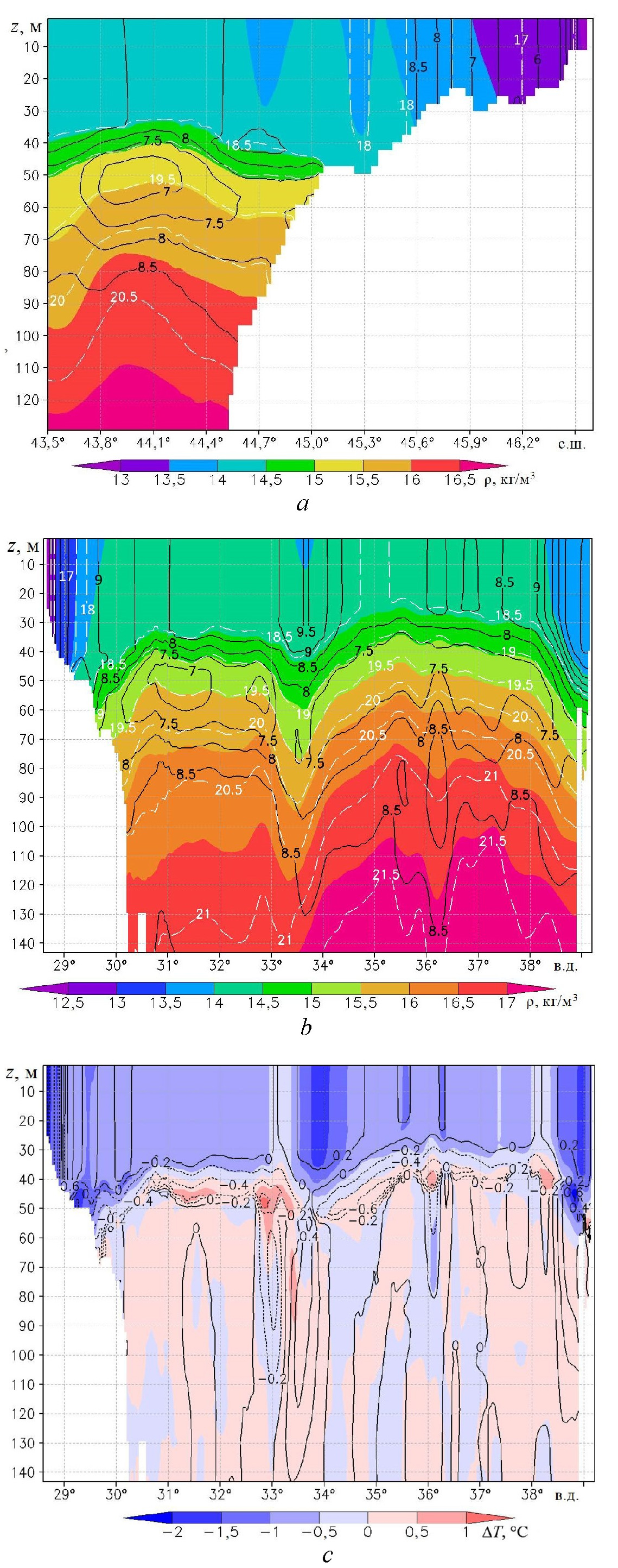 Fig.4. Fields of density ρ, kg/m3, temperature T, ℃, (black isolines) and salinity S, ‰, (white isolines) at 00:00, January 23 at the zonal section along 31° E (a) and the meridional section along 44° N (b); change in temperature, ℃, and salinity, ‰, (isolines) for the period from 00:00, January 23 to 00:00, January 26 at the section along 44° N (c). For clarity, not the very value of ρ, but the difference (ρ – 1000), kg/m3, is shown in Fig. 4, a, b